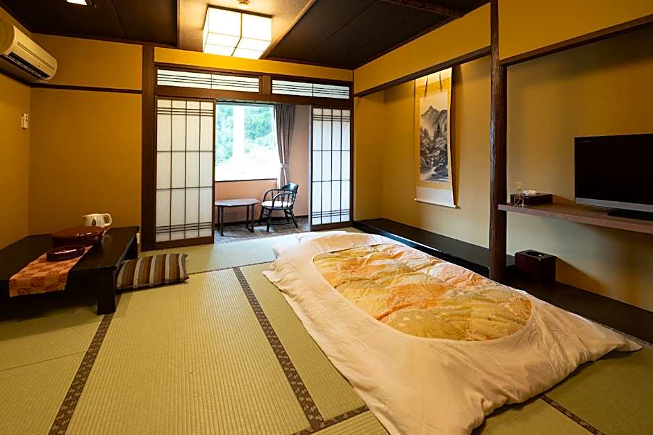 The quadruple room provides a safe deposit box, yukata, as well as a shared bathroom boasting a bidet and slippers. The air-conditioned quadruple room offers a flat-screen TV, tatami, a tea and coffee maker, a wardrobe as well as garden views. The unit has 4 futons.